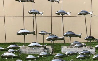不銹鋼小魚雕塑實拍圖 一條條小魚組成的魚群雕塑